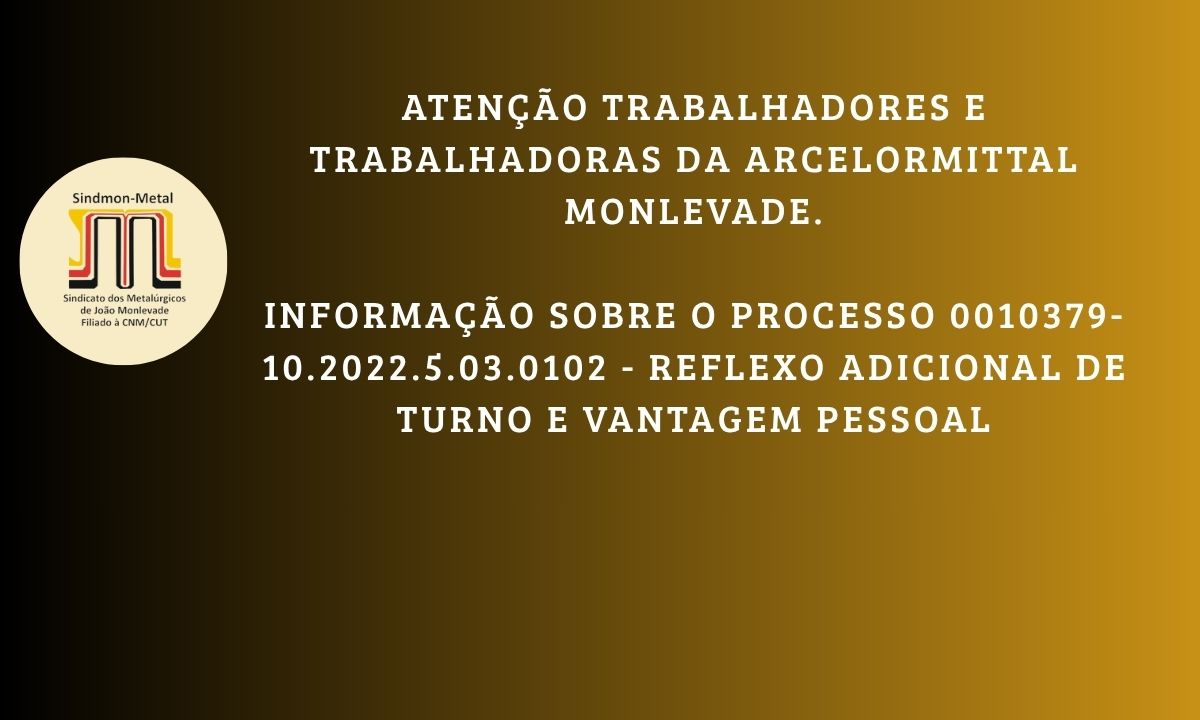 Se você trabalhou ou trabalha na ArcelorMittal Monlevade entre 13 de junho de 2020 até os dias atuais no turno de revezamento você pode ter direito ao processo referente ao reflexo de adicionais de turno e vantagem pessoal – no. 0010379-10.2022.5.03.0102