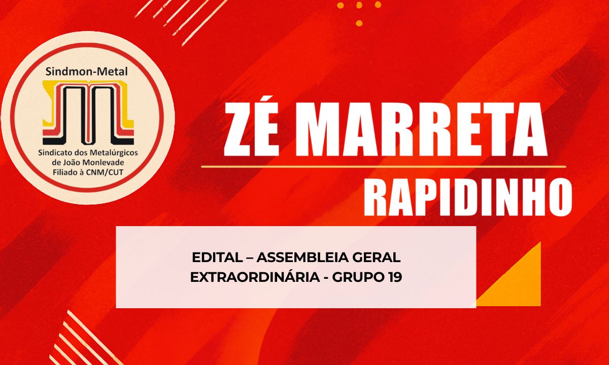O Sindicato dos Trabalhadores Metalúrgicos de João Monlevade convoca todos os trabalhadores e trabalhadoras do GRUPO 19, sócios e não sócios do Sindicato, para a ASSEMBLEIA GERAL EXTRAORDINÁRIA, a se realizar no dia 16 de janeiro de 2026, sexta-feira, às 16h30, em primeira convocação, e às 17h, em segunda convocação, com qualquer número, na sede do Sindicato, à rua Duque de Caxias, 165, bairro José Elói, João Monlevade. Estarão aptos a votar os trabalhadores que chegarem dentro do horário marcado e assinarem a lista de presença.
