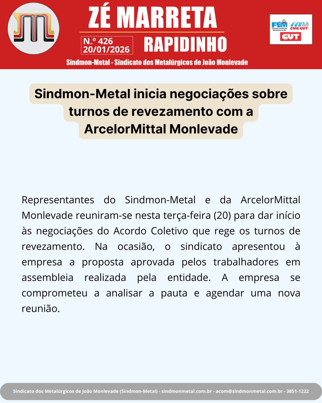 Representantes do Sindmon-Metal e da ArcelorMittal Monlevade reuniram-se nesta terça-feira (20) para dar início às negociações do Acordo Coletivo que rege os turnos de revezamento. Na ocasião, o sindicato apresentou à empresa a proposta aprovada pelos trabalhadores em assembleia realizada pela entidade. A empresa se comprometeu a analisar a pauta e agendar uma nova reunião.