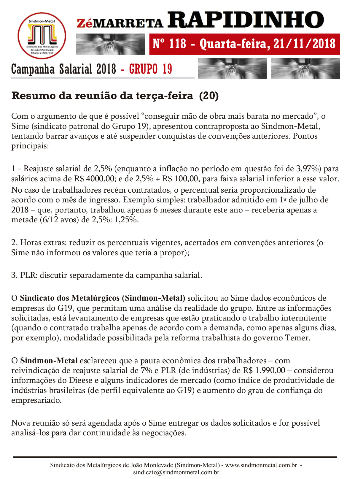 Versão em PDF RECEBIMENTO DE BOLETIM POR EMAILDigite abaixo seu email. Recebimento a partir da próxima edição. Enviar Navegação de Post RAPIDINHO Nº 117 – Como foi a reunião de segunda-feira, 12 RAPIDINHO Nº 119 – Campanha Salarial ArcelorMittal – Reunião de 27/11