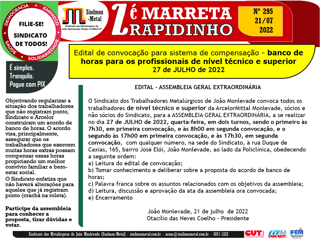 O Sindicato dos Trabalhadores Metalúrgicos de João Monlevade convoca todos os trabalhadores de nível técnico e superior da ArcelorMittal Monlevade, sócios e não sócios do Sindicato, para a ASSEMBLEIA GERAL EXTRAORDINÁRIA, a se realizar no dia 27 de JULHO de 2022, quarta-feira, em dois turnos, sendo o primeiro às 7h30, em primeira convocação, e às 8h00 em segunda convocação, e o segundo às 17h00 em primeira convocação, e às 17h30, em segunda convocação,  com qualquer número, na sede do Sindicato, à rua Duque de Caxias, 165, bairro José Elói, João Monlevade, ao lado da Policlínica, obedecendo a seguinte ordem:
