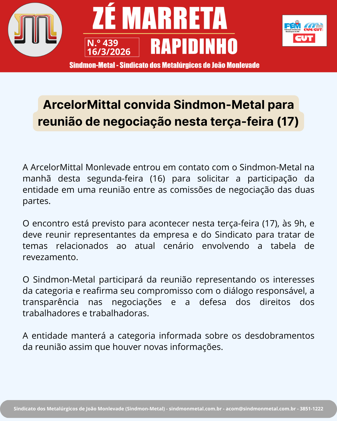 O Sindmon-Metal participará da reunião representando os interesses da categoria e reafirma seu compromisso com o diálogo responsável, a transparência nas negociações e a defesa dos direitos dos trabalhadores e trabalhadoras.