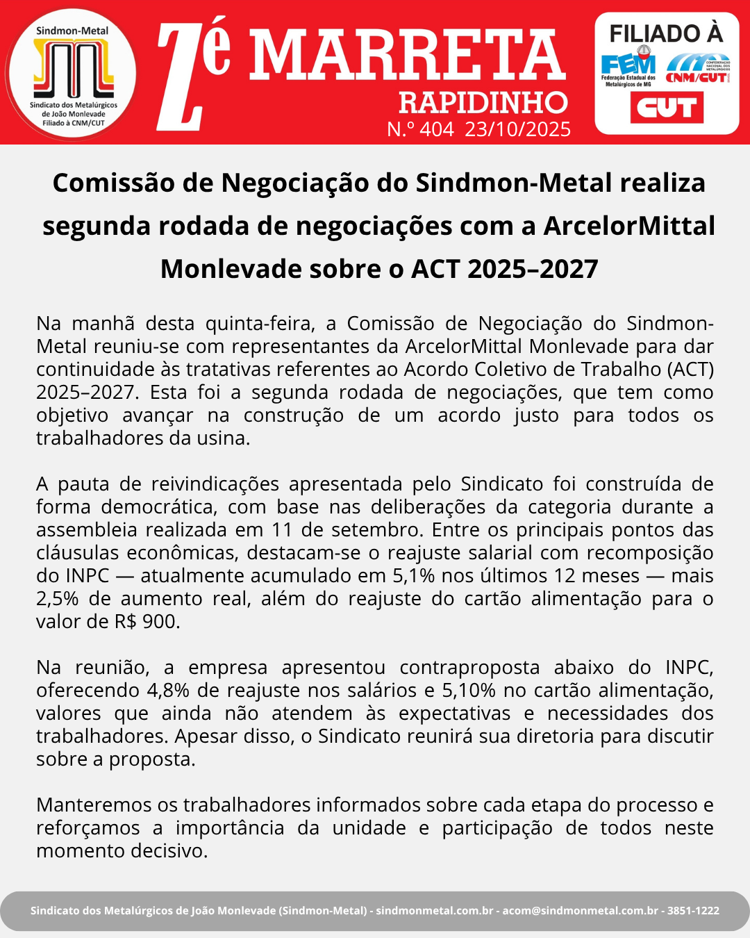 Negociação Coletiva ArcelorMittal 2025 Navegação de Post Negociações 2025/2026: Sindmon-Metal inicia negociação com o SIME