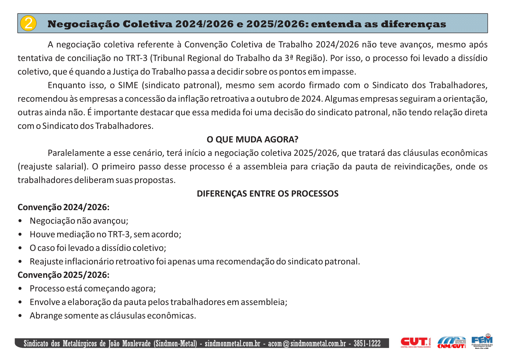 Paralelamente a esse cenário, terá início a negociação coletiva 2025/2026, que tratará das cláusulas econômicas (reajuste salarial). O primeiro passo desse processo é a assembleia para criação da pauta de reivindicações, onde os trabalhadores deliberam suas propostas.