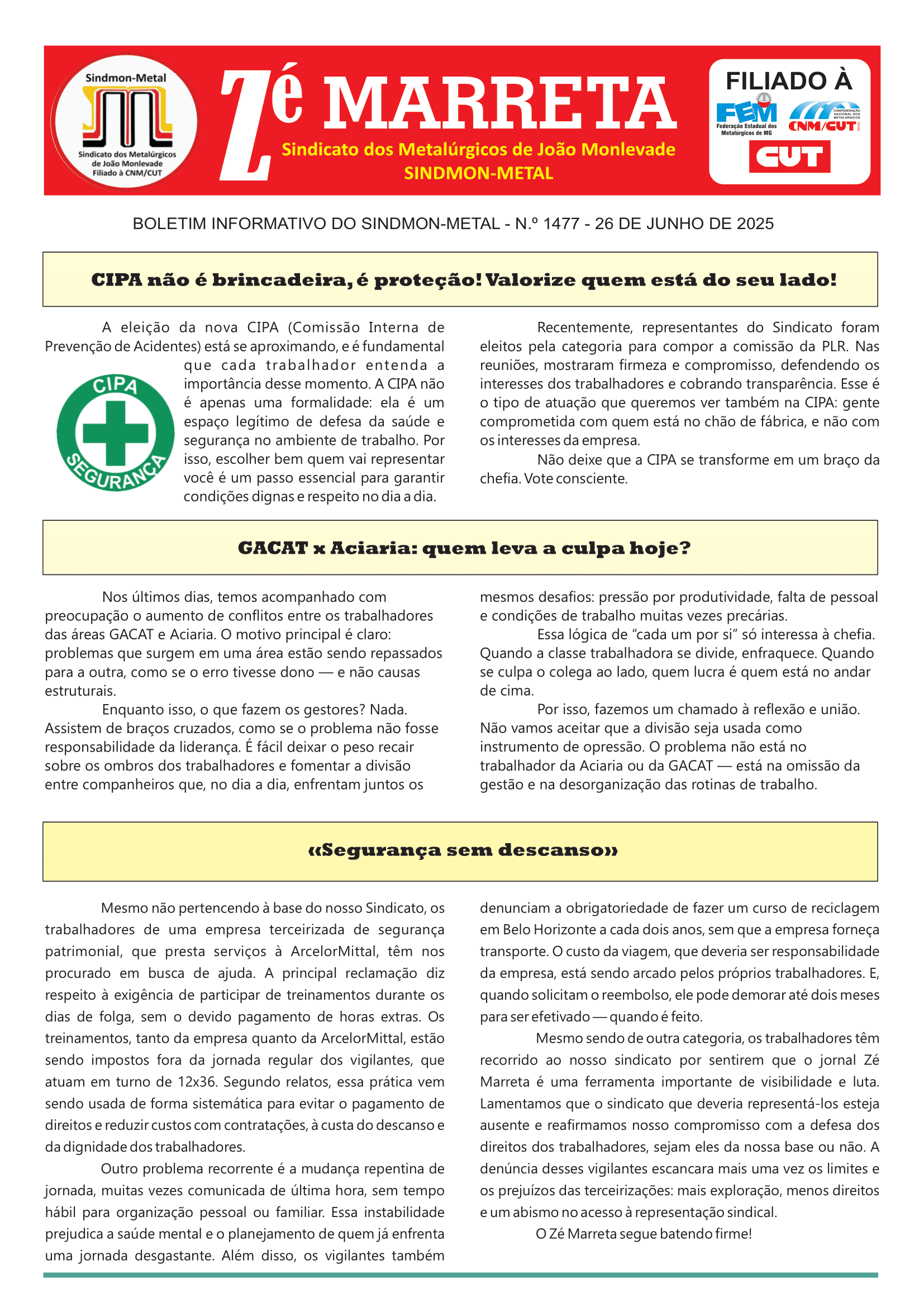 Por isso, fazemos um chamado à reflexão e união. Não vamos aceitar que a divisão seja usada como instrumento de opressão. O problema não está no trabalhador da Aciaria ou da GACAT — está na omissão da gestão e na desorganização das rotinas de trabalho.