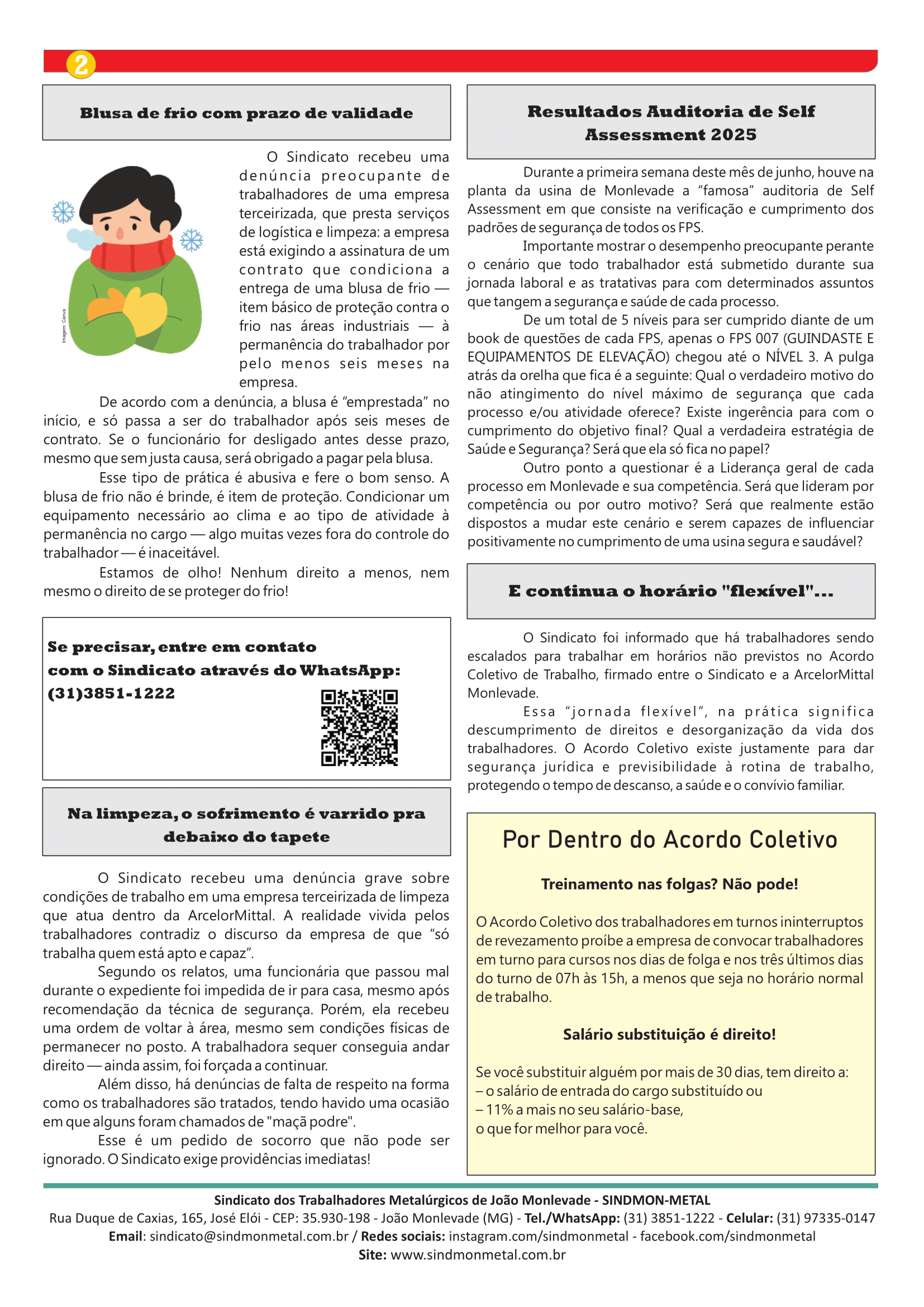 Mesmo não pertencendo à base do nosso Sindicato, os trabalhadores de uma empresa terceirizada de segurança patrimonial, que presta serviços à ArcelorMittal, têm nos procurado em busca de ajuda. A principal reclamação diz respeito à exigência de participar de treinamentos durante os dias de folga, sem o devido pagamento de horas extras. Os treinamentos, tanto da empresa quanto da ArcelorMittal, estão sendo impostos fora da jornada regular dos vigilantes, que atuam em turno de 12×36. Segundo relatos, essa prática vem sendo usada de forma sistemática para evitar o pagamento de direitos e reduzir custos com contratações, à custa do descanso e da dignidade dos trabalhadores.