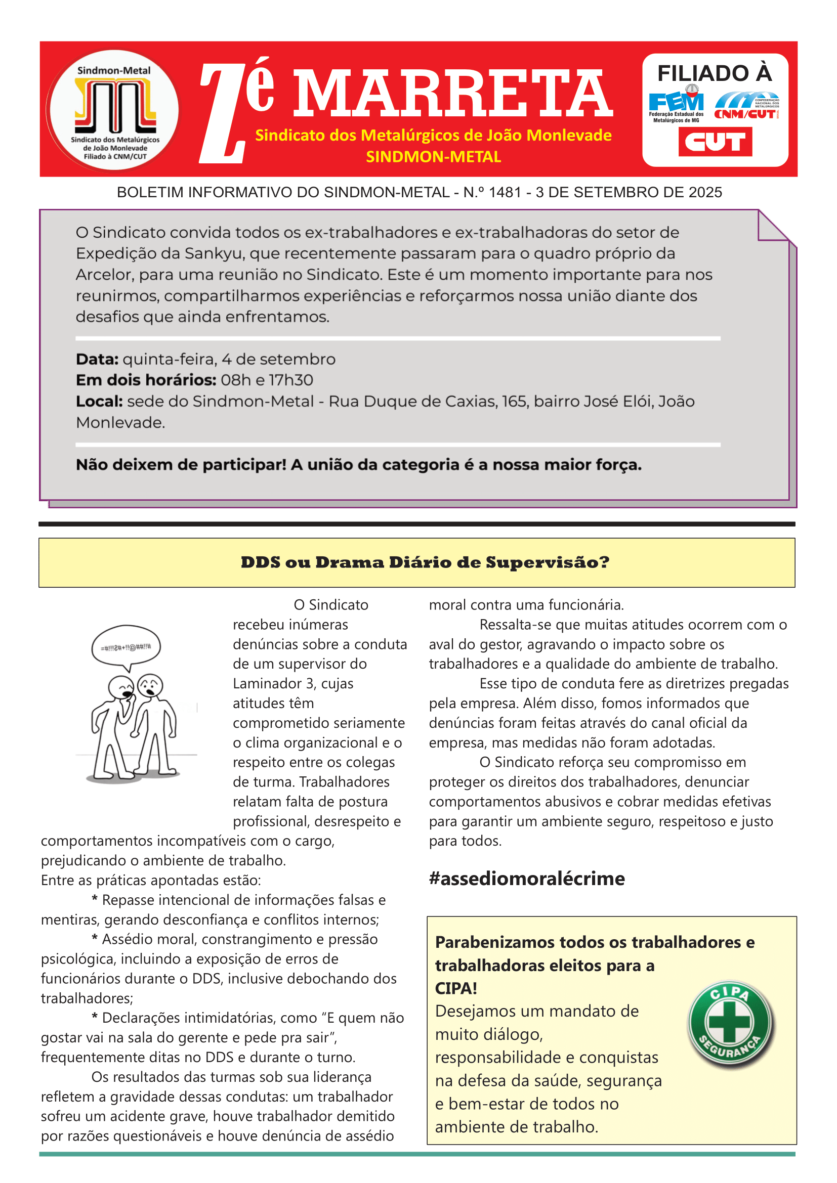 O Sindicato recebeu inúmeras denúncias sobre a conduta de um supervisor do Laminador 3, cujas atitudes têm comprometido seriamente o clima organizacional e o respeito entre os colegas de turma. Trabalhadores relatam falta de postura profissional, desrespeito e comportamentos incompatíveis com o cargo, prejudicando o ambiente de trabalho.