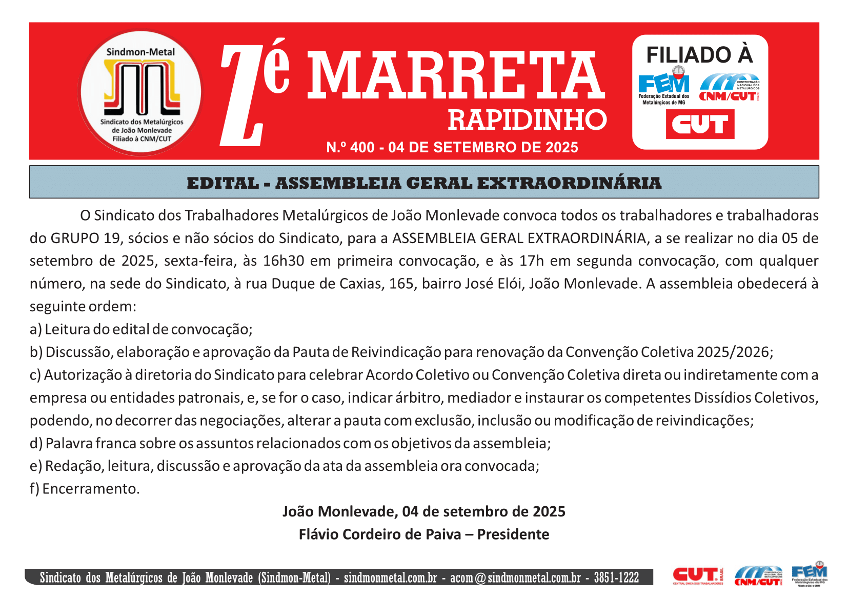 O Sindicato dos Trabalhadores Metalúrgicos de João Monlevade convoca todos os trabalhadores e trabalhadoras do GRUPO 19, sócios e não sócios do Sindicato, para a ASSEMBLEIA GERAL EXTRAORDINÁRIA, a se realizar no dia 05 de setembro de 2025, sexta-feira, às 16h30 em primeira convocação, e às 17h em segunda convocação, com qualquer número, na sede do Sindicato, à rua Duque de Caxias, 165, bairro José Elói, João Monlevade. A assembleia obedecerá à seguinte ordem: