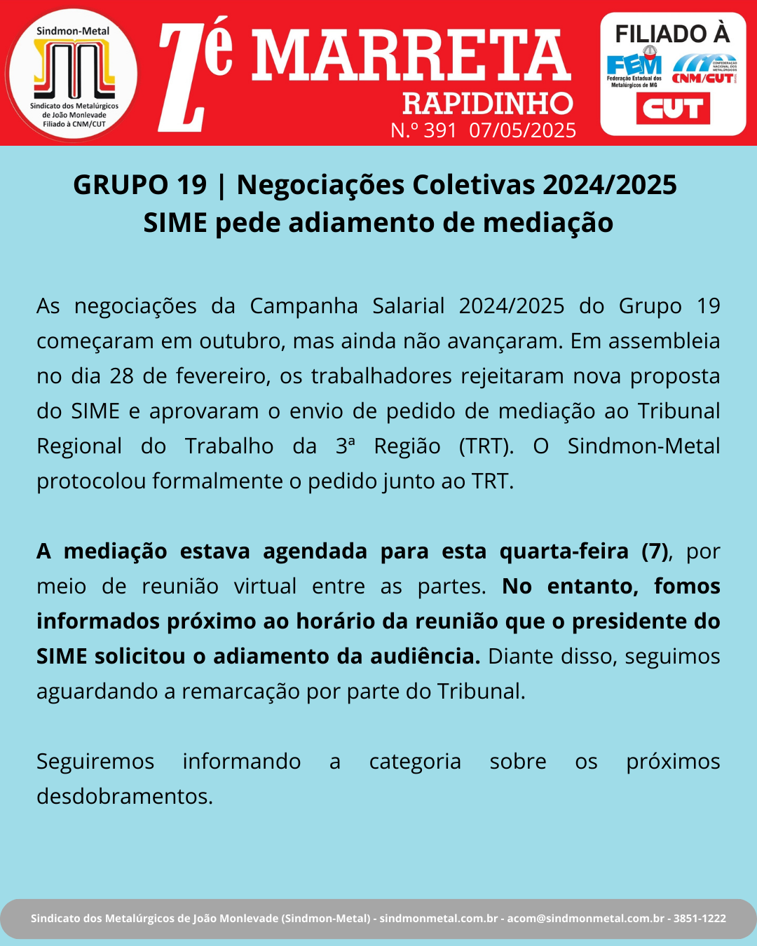 As negociações da Campanha Salarial 2024/2025 do Grupo 19 começaram em outubro, mas ainda não avançaram. Em assembleia no dia 28 de fevereiro, os trabalhadores rejeitaram nova proposta do SIME e aprovaram o envio de pedido de mediação ao Tribunal Regional do Trabalho da 3ª Região (TRT). O Sindmon-Metal protocolou formalmente o pedido junto ao TRT.