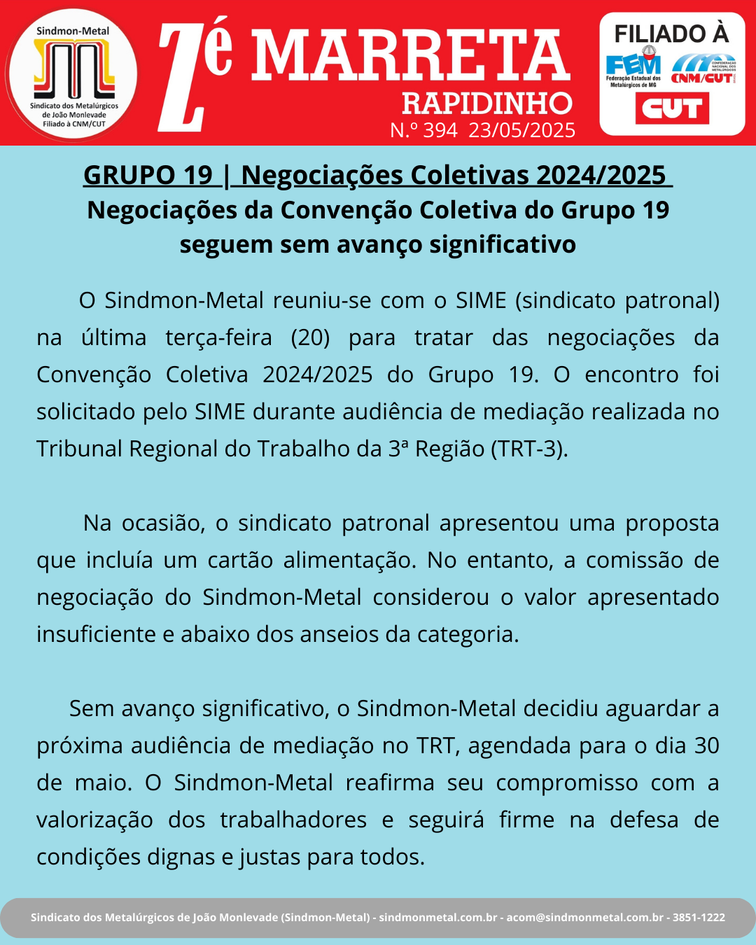 Sem avanço significativo, o Sindmon-Metal decidiu aguardar a próxima audiência de mediação no TRT, agendada para o dia 30 de maio. O Sindmon-Metal reafirma seu compromisso com a valorização dos trabalhadores e seguirá firme na defesa de condições dignas e justas para todos.